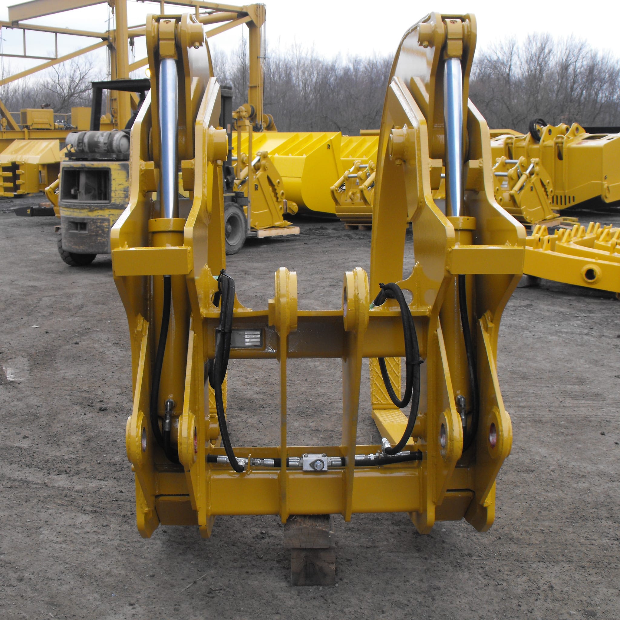The Rockland Dual Clamp Peeler Grapple is the ideal attachment for demanding plywood and peeler applications. Engineered to withstand hard environments, its heavy-duty build guarantees unmatched durability and longevity. Thanks to its narrow frame design, maneuvering between log bunkers and conditioning vats has never been easier. Dual clamps securely hold a full load of peeler logs for easy transport. Equipped with hinged, easily replaceable tines, this grapple offers convenience and versatility on the jobsite. The dual-cushioned cylinders ensure reliable performance and provide years of dependable service.